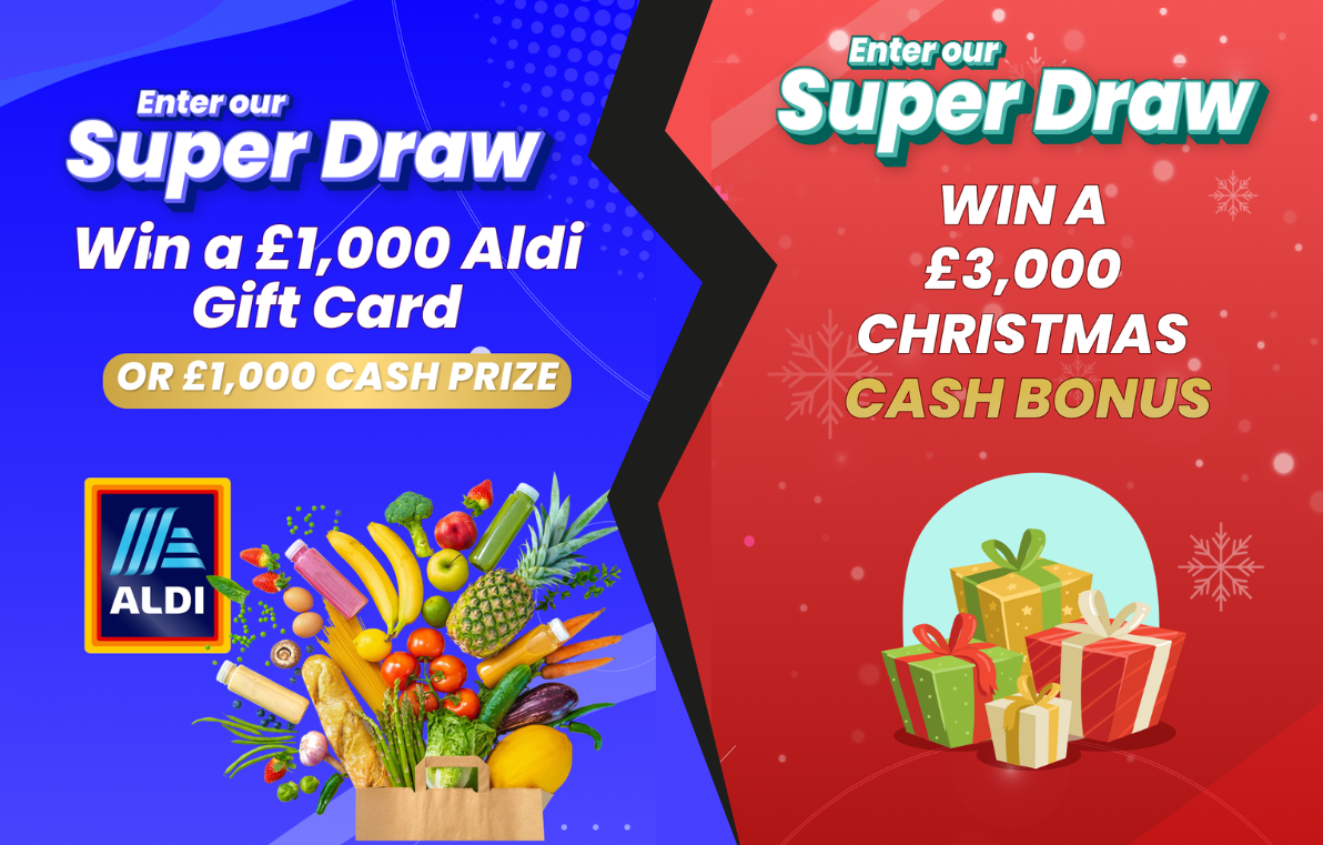 If you’re playing our lottery this December, you could be the lucky winner of an amazing £3,000 Christmas Cash Bonus! Enter before December 21st, and make your Christmas dreams come true with the Super Draw. And because it’s our birthday we want to give you a little sneak peak into what’s happening next. So….. from 23rd December 2024 – 25th January 2025 there is a chance to win a £1,000 Aldi Gift card! Start the year off right with this gift card and see what’s going on down the middle aisle.
