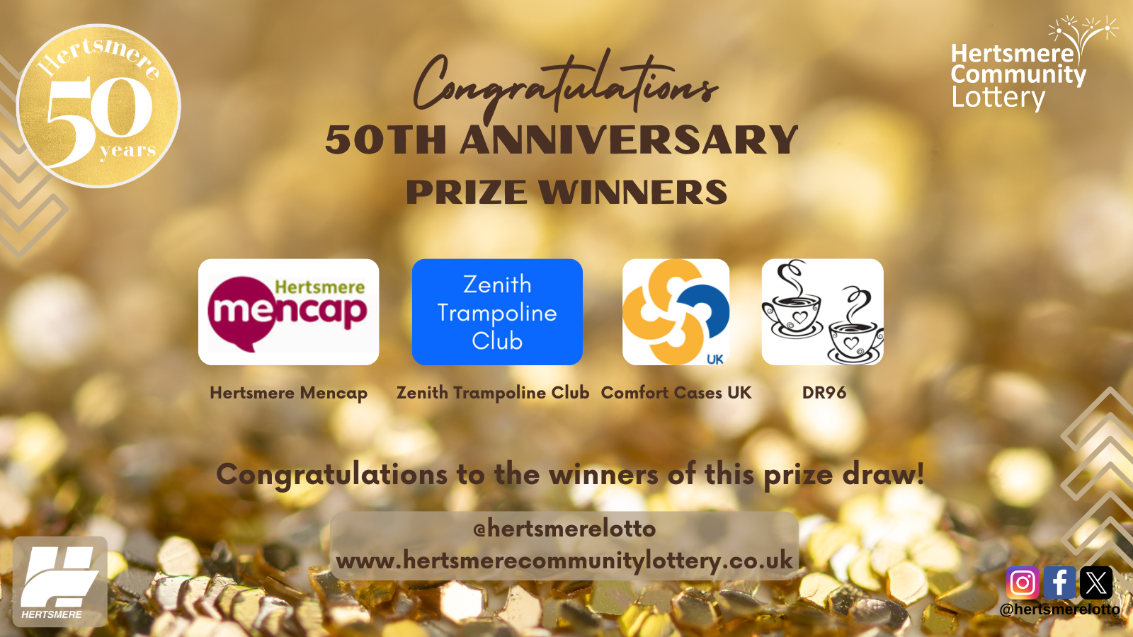 This year we have tried new things and celebrated with the community. We took part in some extra draws and lotteries, such as the Your School Lottery and extra rize draw from January – March 2024. In the summer we also held the 50th Anniversary Prize Draw here at Hertsmere which saw Hertsmere Mencap, Zenith Trampoline Club, Comfort Cases UK and DR96 become winners!